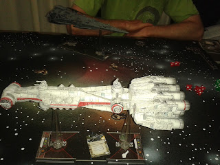 Following on from the first game, we swapped sides and went again, though this time Bruce swapped out...I think it was the single turbo laser...for some Tibanna Gas Supplies, Veteran Instincts and Marksmanship. Marksmanship on the corvette. Brilliant!